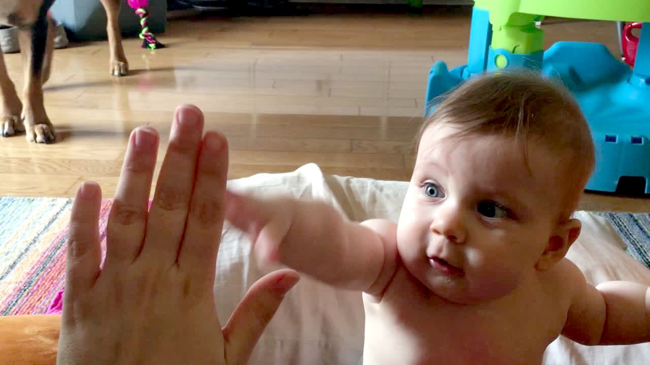 A boy tot stands in the living room and says he needs new socks for Christmas because he has stinky feet.