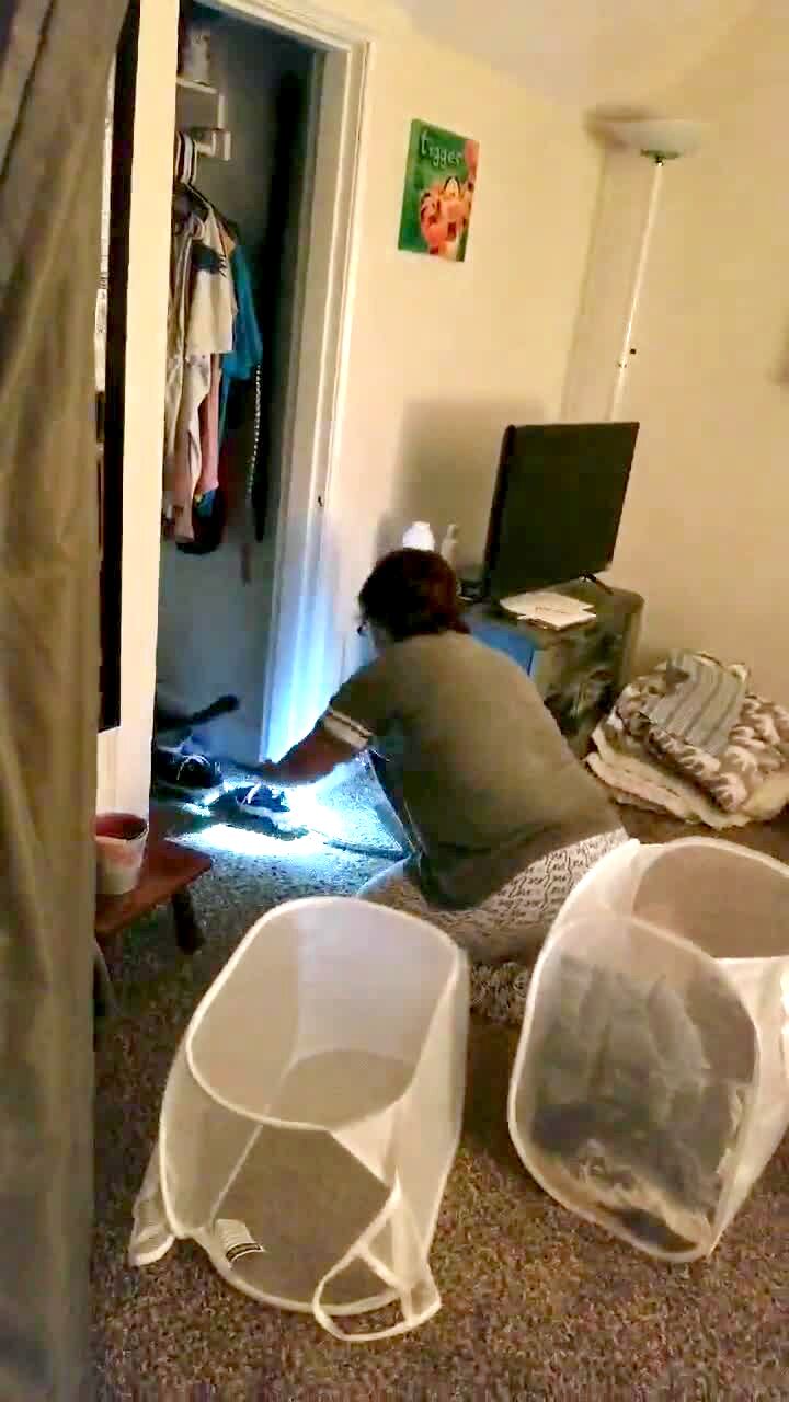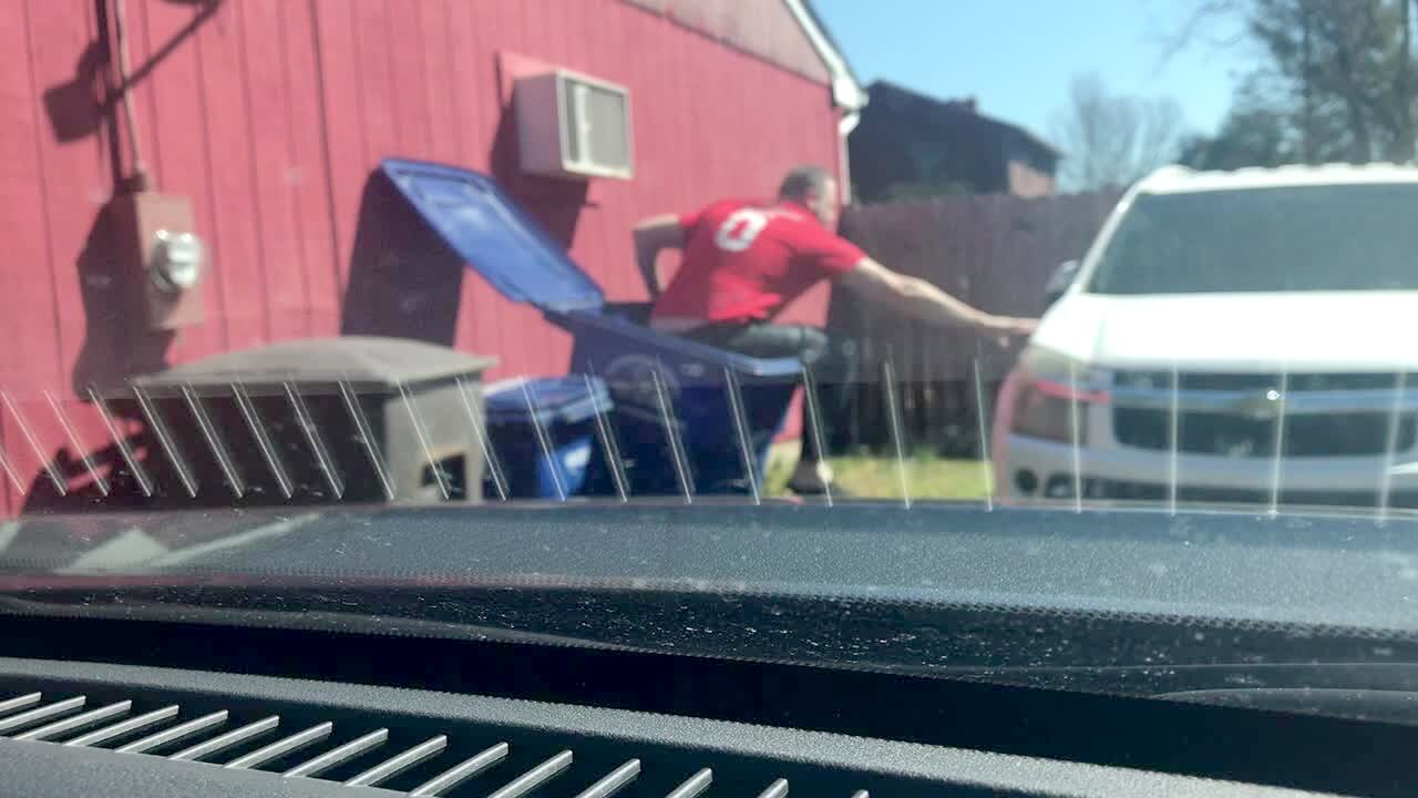 A man hangs Christmas lights on the porch and then they slip and fall and then the rest of the lights fall off the porch. Ring home security camera.