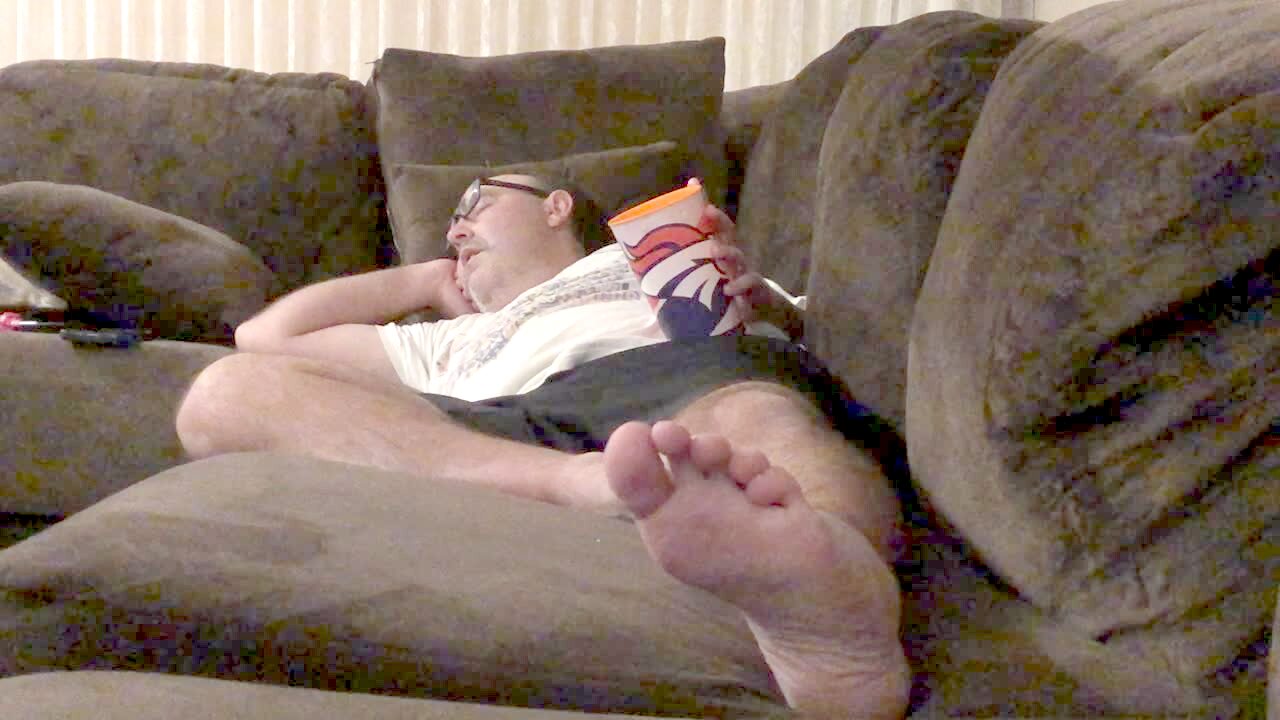 A dad tries to ride a hover board in a living room, but falls backwards. He lands on a pile of presents under a Christmas tree and breaks and shatters ornaments.