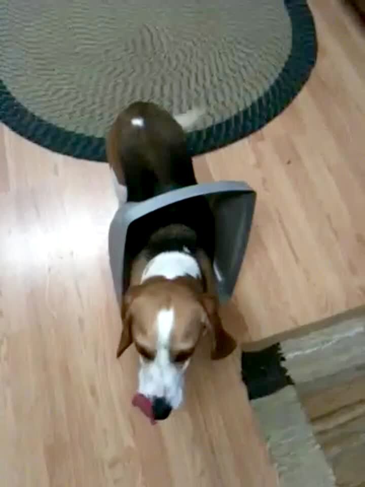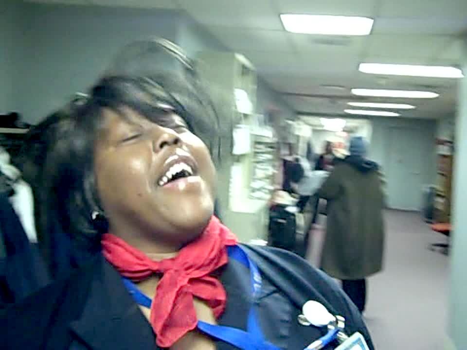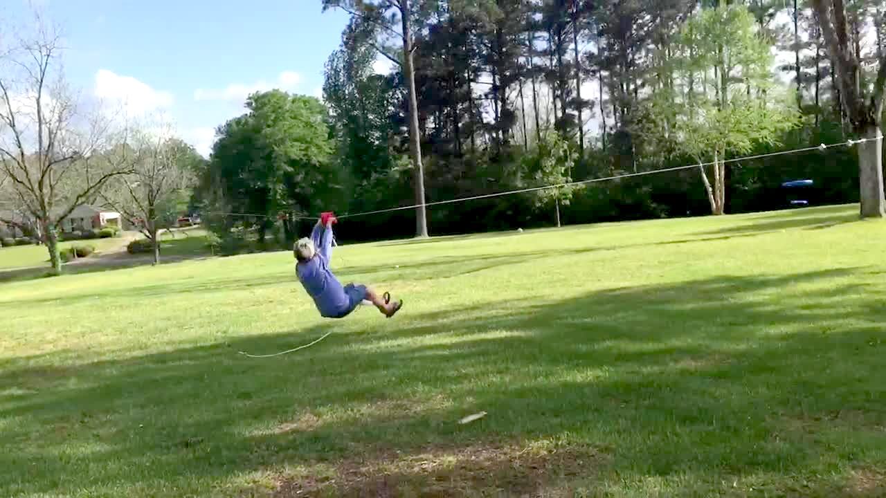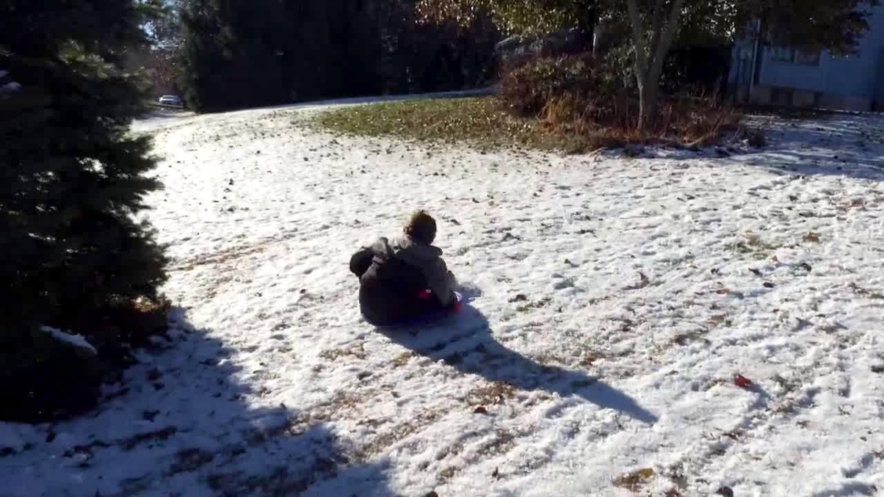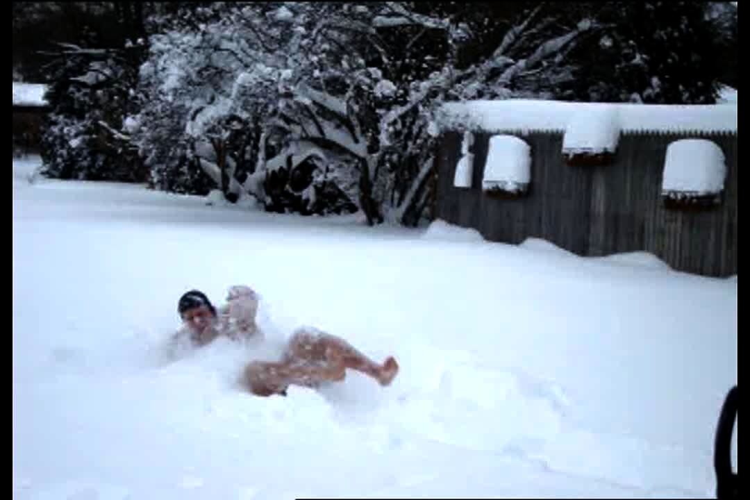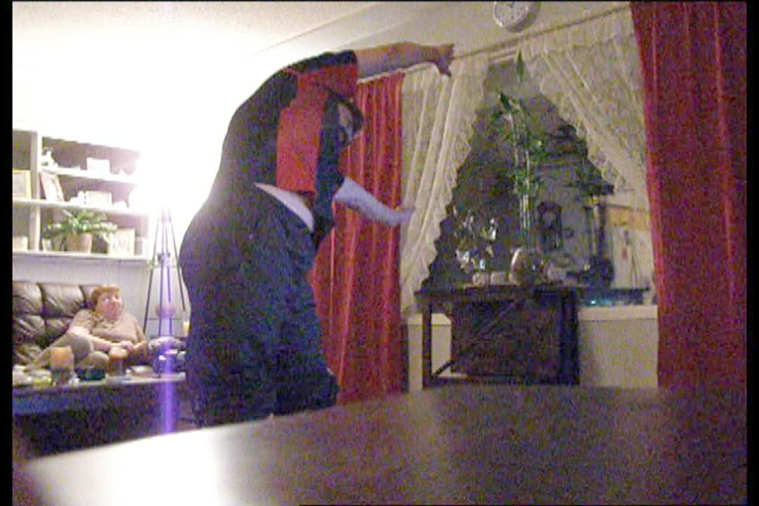 A young girl starts to drive her power wheels toy convertible car that she got as a Christmas present backwards down the sidewalk. Her grandma walks towards her and then the girl suddenly starts to drive forward and crashes into her grandma. The senior woman spreads her legs to let the car go under her, but then the girl hits her head on her grandma's groin and gets stuck there until the car tips back far enough for her to slide through.