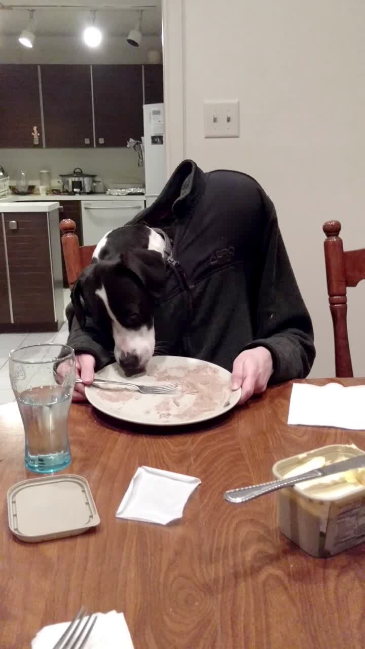 A large German Shepard dog chases a boy holding his stuffed animal toy and jumps on a table.