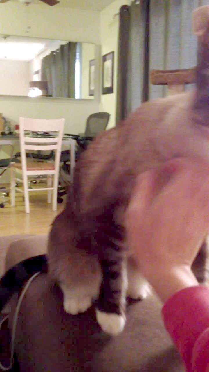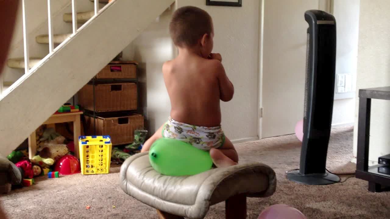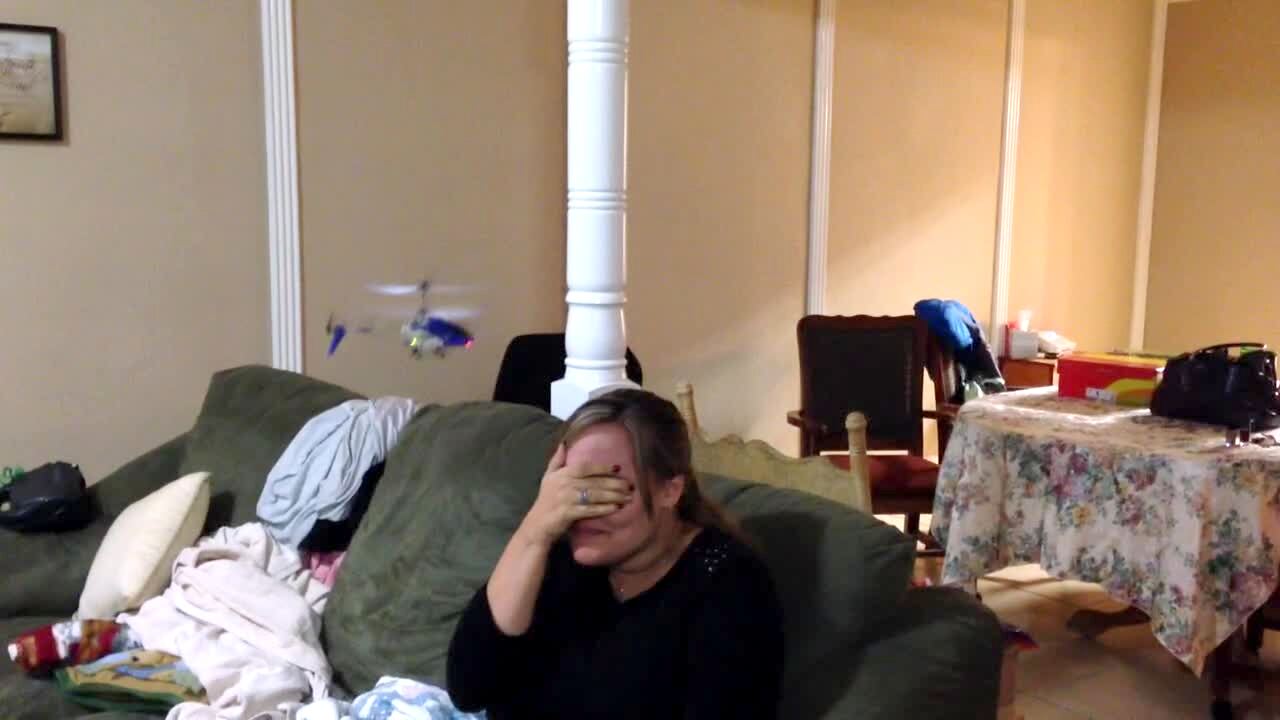 A man flies a remote-controlled drone indoors and his family, including his cat, watches it, but the cat doesn't notice a tot boy walking up to him and suddenly leaps off the couch. Scare.