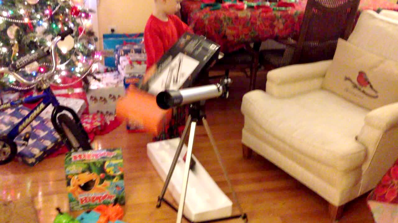 A young boy examines an empty telescope box on Christmas morning when he can't find the telescope he got as a present, even though the telescope is set up directly in front of him. He wonders if Santa Claus brought him an empty box until he puts his hand on the telescope and breaks it.