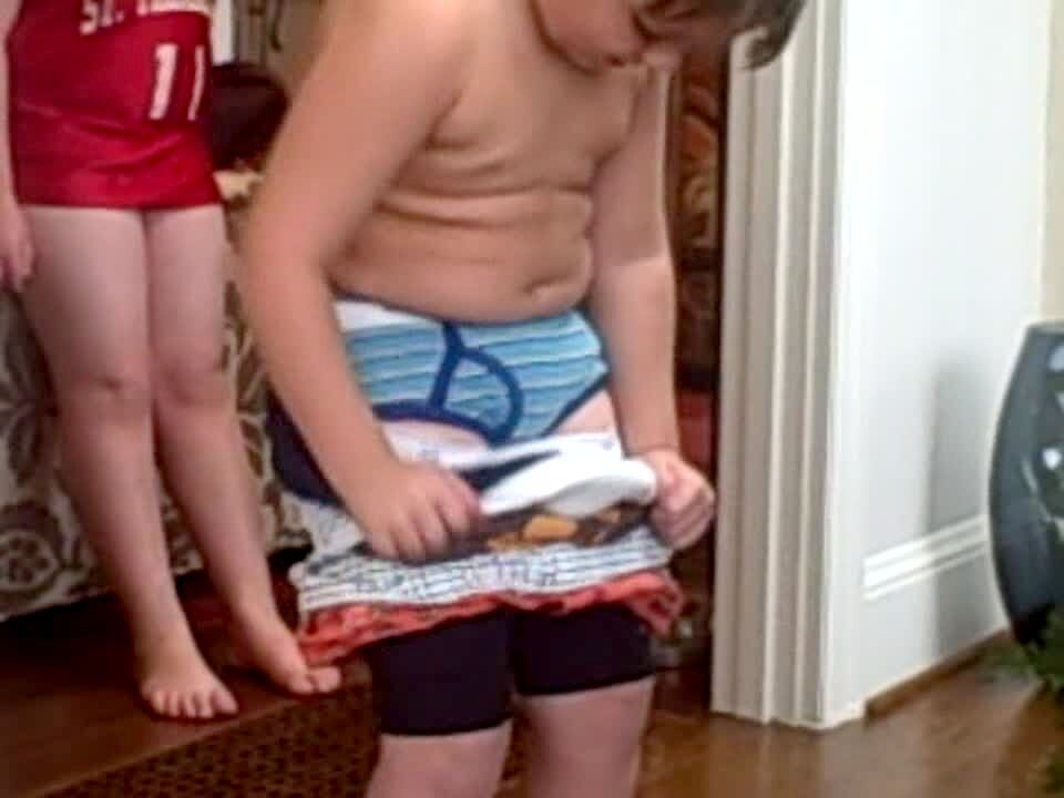 Young chubby boy walks into living room wearing multiple pairs of underwear. He takes each one off.