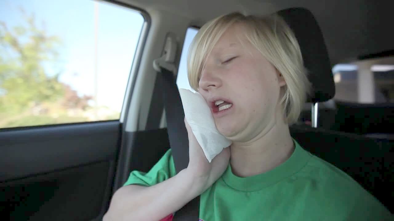 A teen boy slips and falls as he walks down the front porch stairs. His younger sister comes out and he yells at her to not go down the stairs, but then their dad comes and says "you know there's handrails right?" He then walks down the stairs and also slips, and he tells the young girl not to go down the stairs as well.