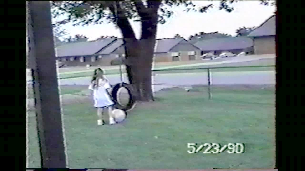 A young girl puts her phone down in the yard to record herself on the swings, and a border collie dog pees on it. First person POV.