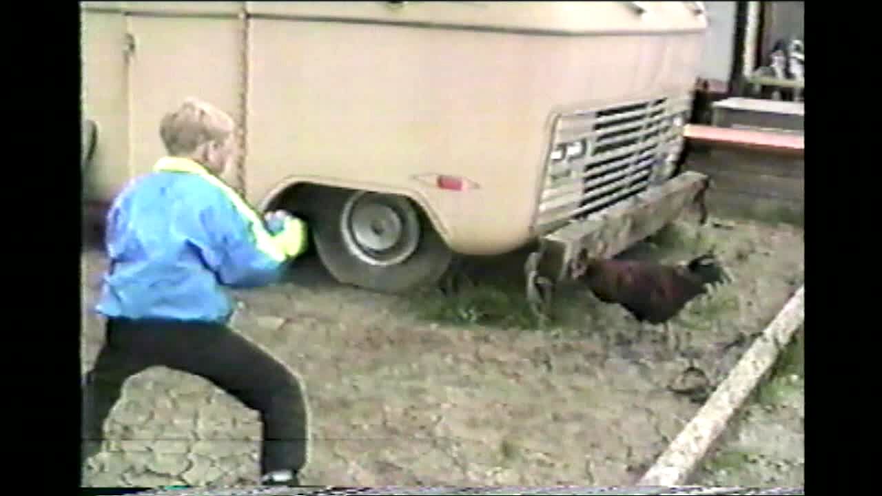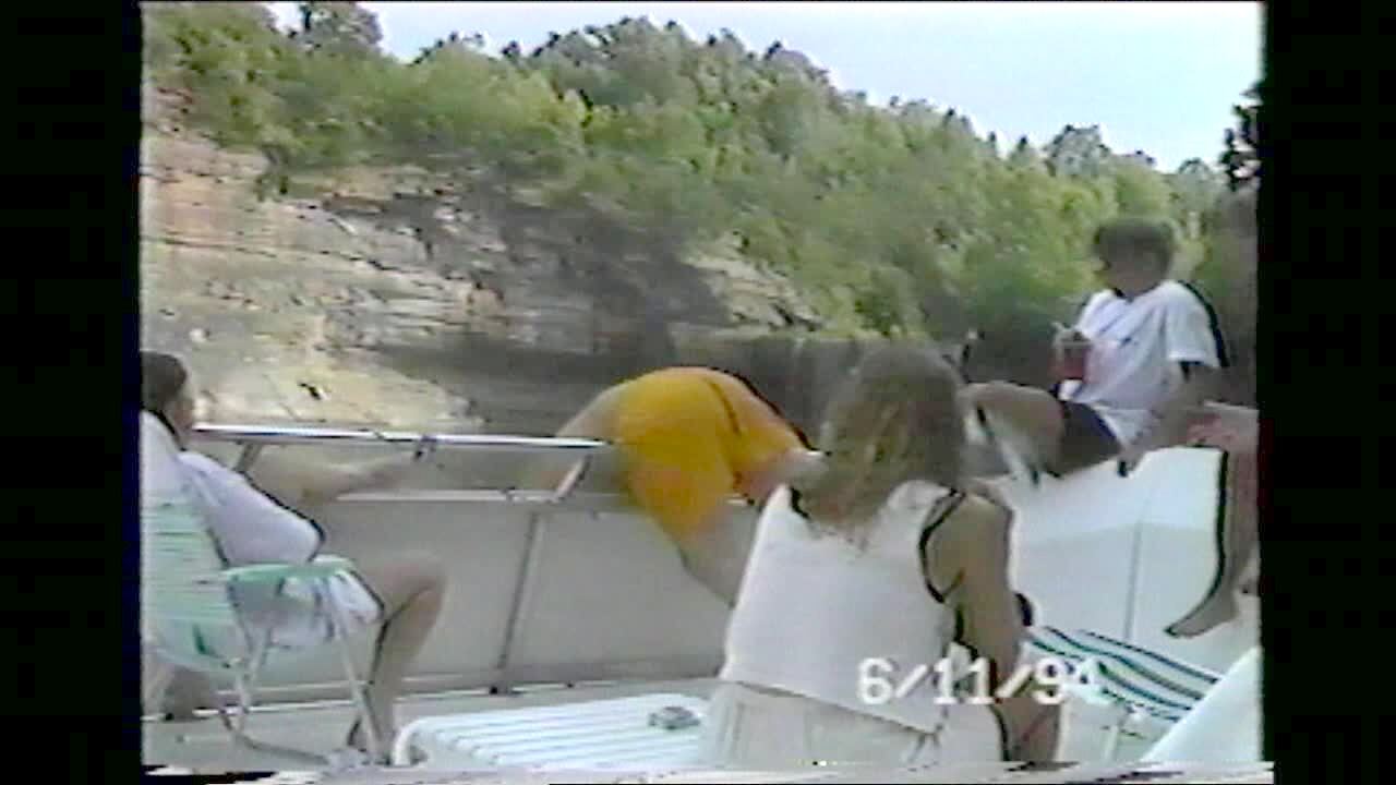 A father rides in an inflatable tube tied to a boat, but it flips him over into a lake, and his kids cry and scream.