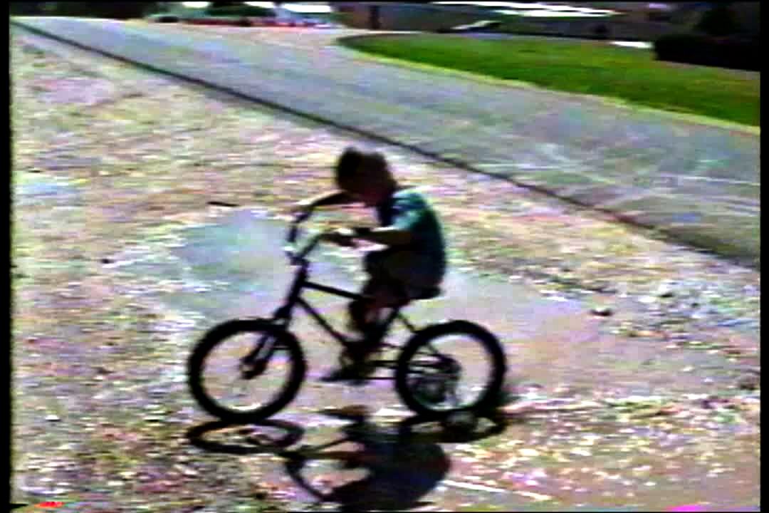 Boy with long hair rides a unicycle on top of a large log. He falls off the unicycle. No recovery, he doesn't get up. Park.