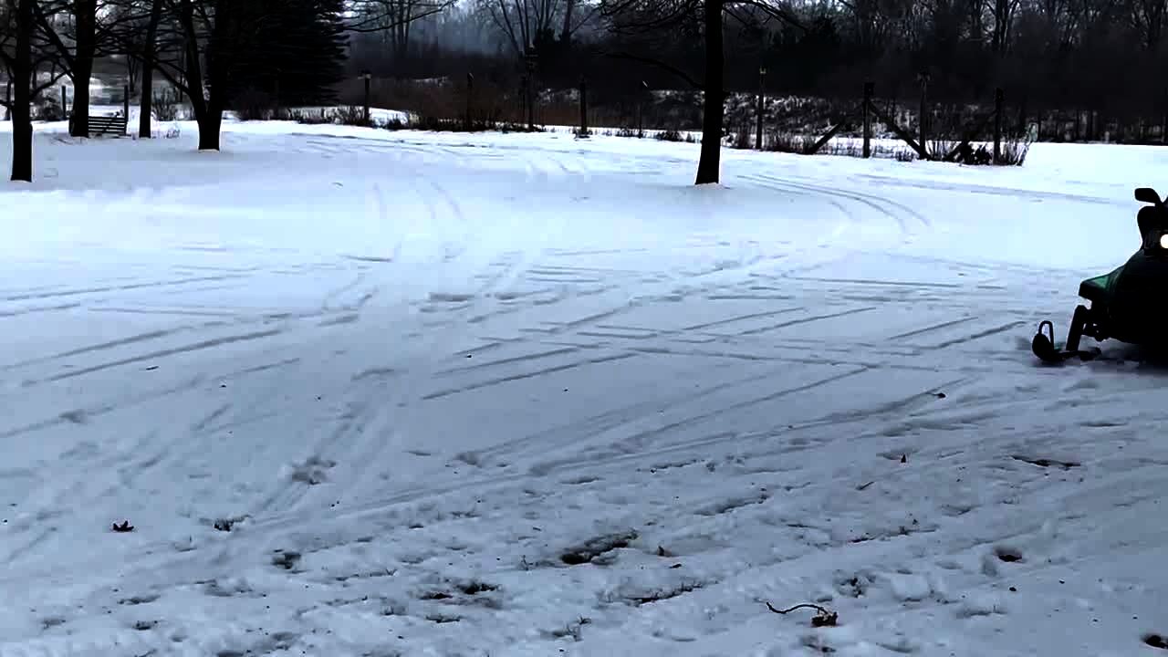 A young girl and her brother sled down a flight of snow covered stairs on a plank of wood, but they crash into a railing and break it. Security footage.
