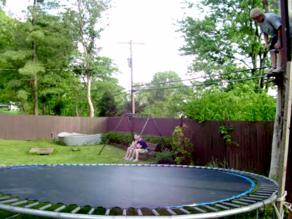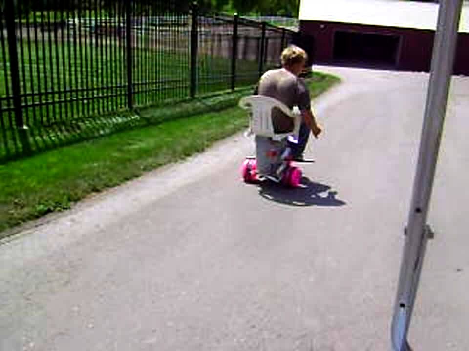 Two girls are running down a driveway to get into the garage before the door closes. One girl runs right into the door, which knocks her flat on her back.