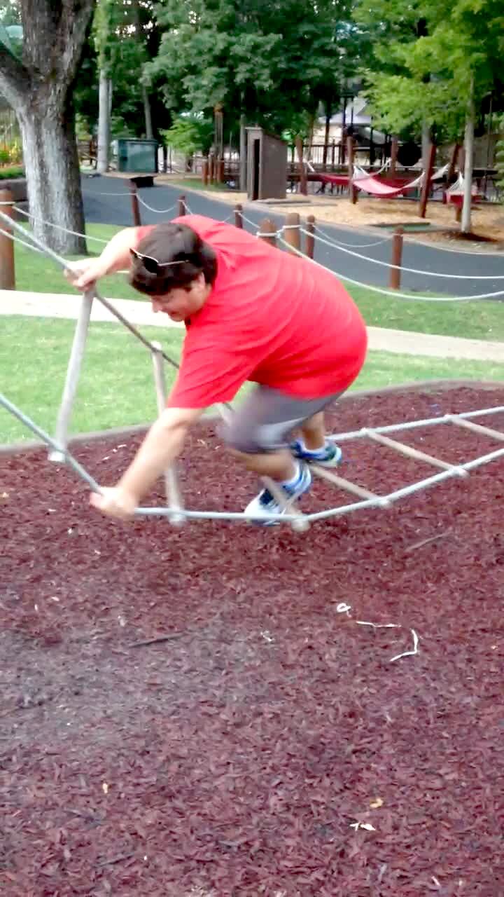 A young boy walks across a tight rope and slips and falls and lands on his groin.