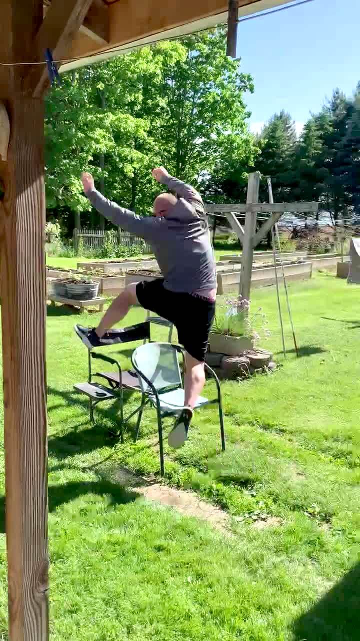 A large bug is on a woman's shirt while she sits in a patio chair with a drink in her hand. Another woman tries to get the bug to walk onto her phone, but it jumps back at the first woman, and she spills her drink all over herself. Featured talent cleared (the woman with the drink and her friend with the phone).