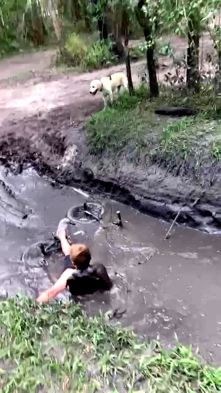 A young boy pedals his bicycle while it is stuck in a deep mud puddle outside, but the bicycle does not move, and water splashes all over his back.