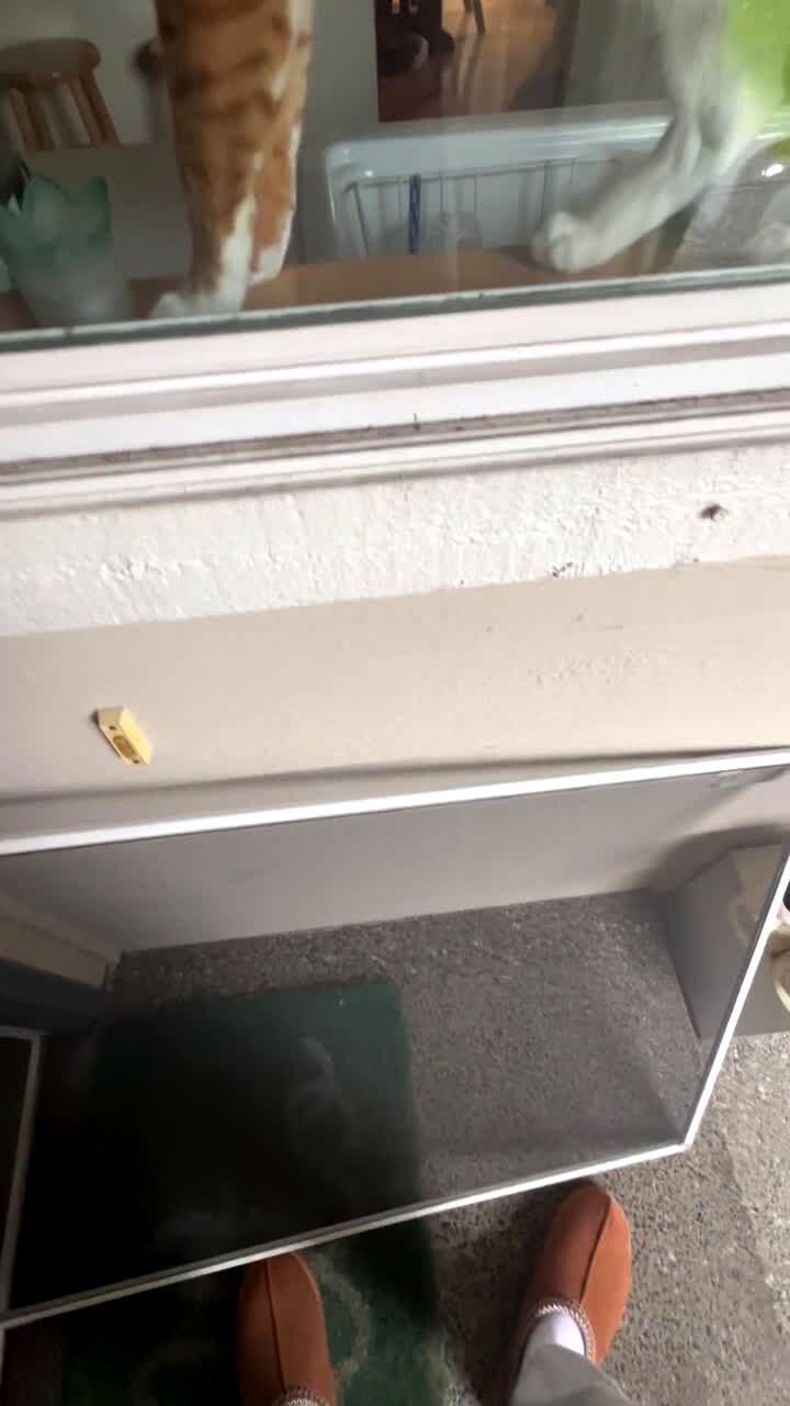 A man walks a Bulldog dog down the front porch but the dog's harness comes off. The man doesn't notice and continues to walk as the dog watches. Security Footage.