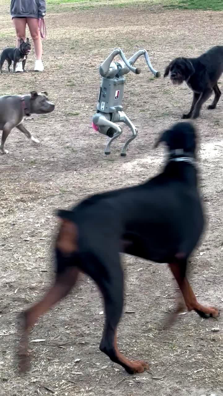 A bunch of dogs in a dog park bark at a robot dog with a hat on as it does a handstand. No appearance releases on file (people not really visible).