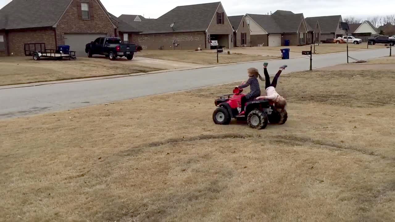 A girl helps her mom balance on a hoverboard in the living room. The woman loses balance and falls off the board. She pulls her daughter down too. Security footage.