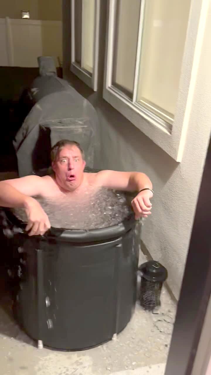 A senior man stands in a swimming pool with his dog. He steps off a ledge in the shallow end and is surprised by how steep the drop off is and how deep the water is. He is submerged in the pool.