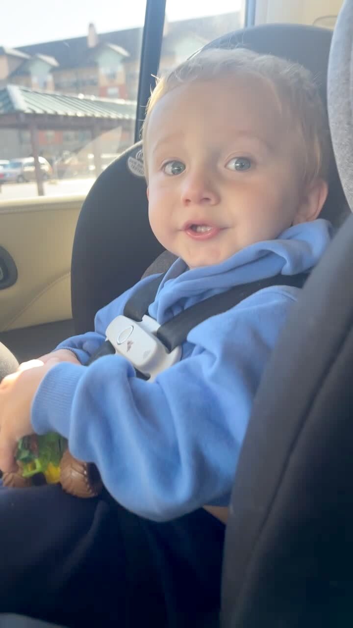 A woman attempts to film a baby girl as a dog gets in front of her car seat to try and get all the attention.