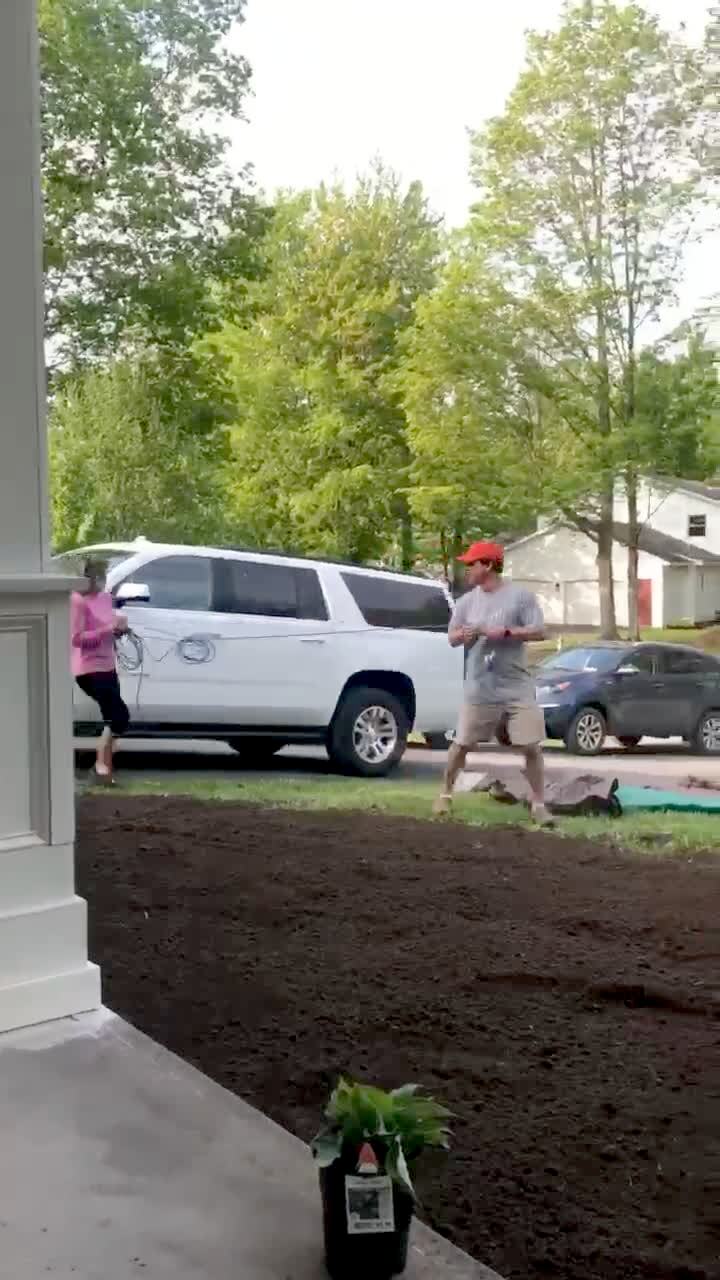 A woman greets a herd of deer in a yard, then her dog chases them away.