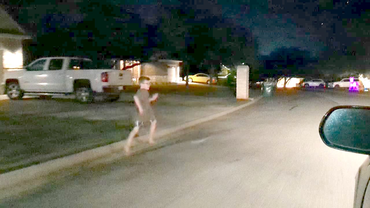 A young boy rings the doorbell outside. A dog runs and pushes the screen off of the screen door into the face of the boy. Security footage.