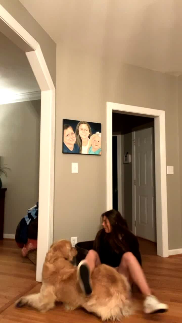 "Canine Camera Caper" A doodle dog jumps over a baby gate at home, then he uses his paws to turn a security camera around. TikTok video. Security footage.