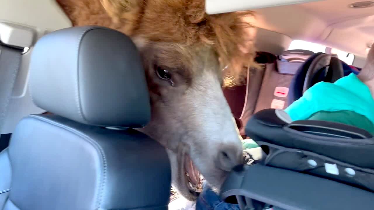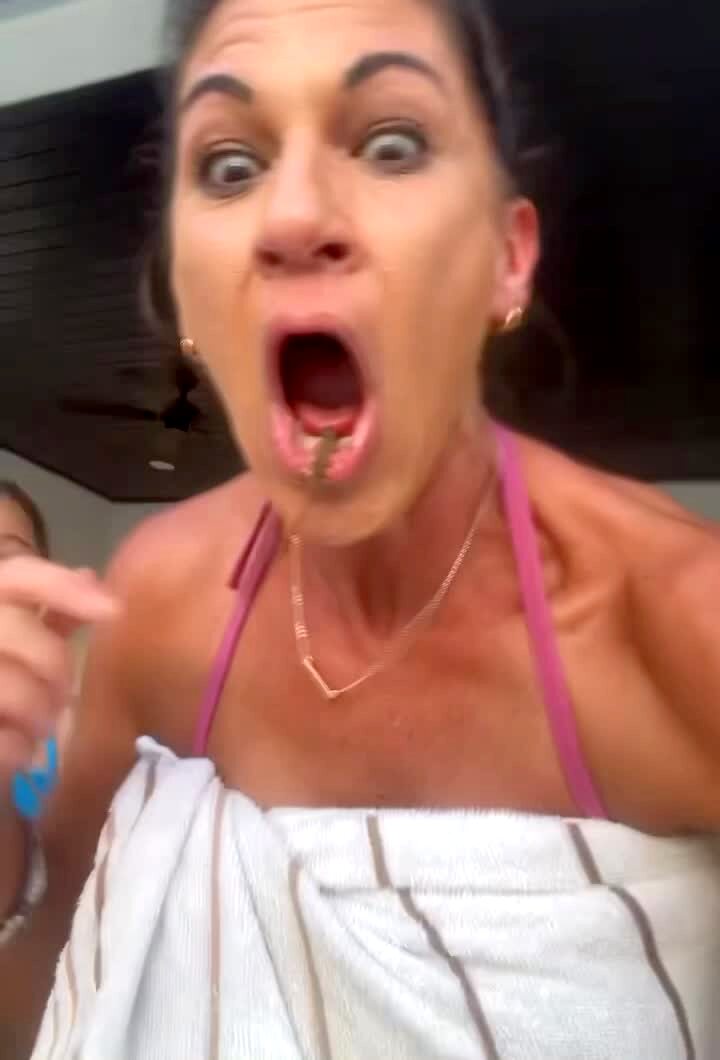 A teen girl attempts to throw a dog toy in the yard and it gets wrapped around her hair causing her pain.