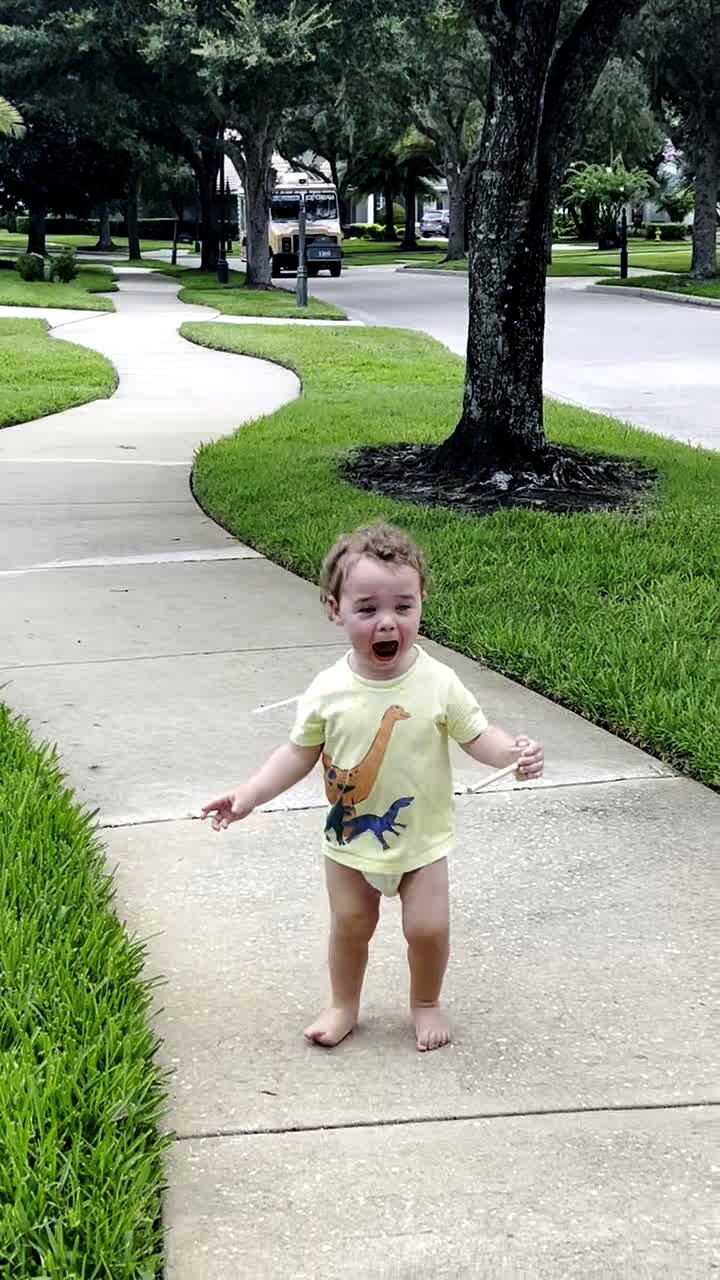 A tot girl swings a stick with hot dogs on it while she cooks over a fire pit in a backyard, then she cries and screams when a golden retriever dog eats the hot dogs off the stick over her shoulder.