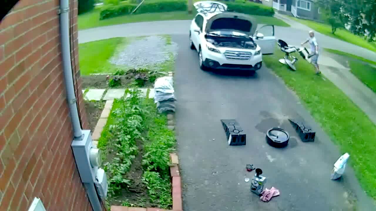 A man walks out of a front door and sits in a chair on a porch with a cup of coffee. He spills the coffee on himself, screams, and quickly takes his shorts off. Security Camera Footage.
