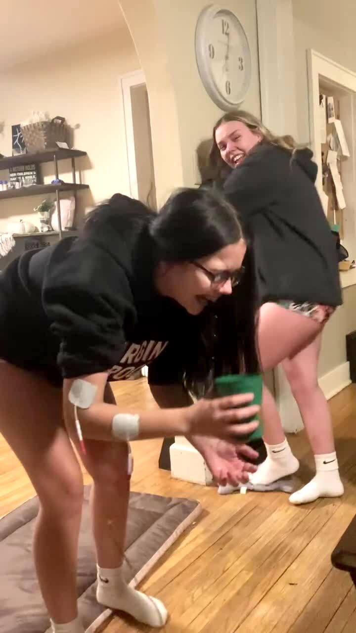 A teen girl takes a drink out of the microwave and pours it into another cup, but she and a French bulldog dog both jump when it explodes. Security footage.