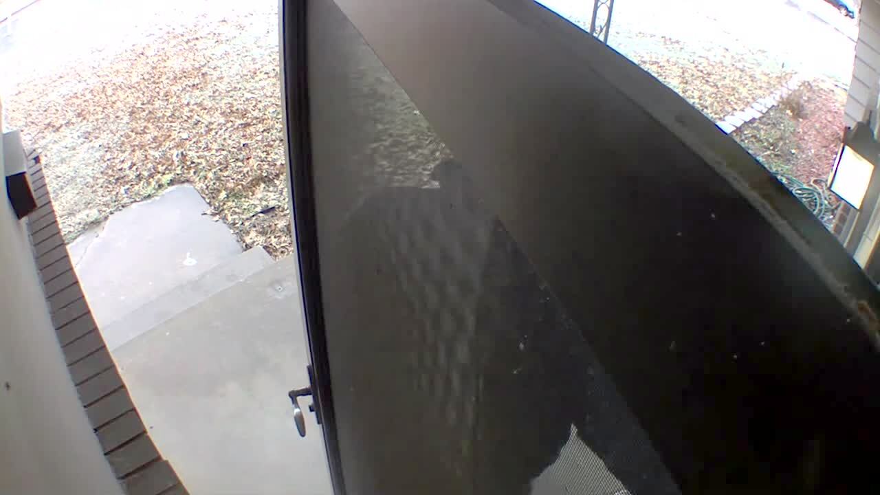 The woman with the camera looks through the peephole on the front door and sees her dog on the front steps. She says the dog caught an iguana and opens the door. The dog stands at in front of her with the iguana in its mouth.