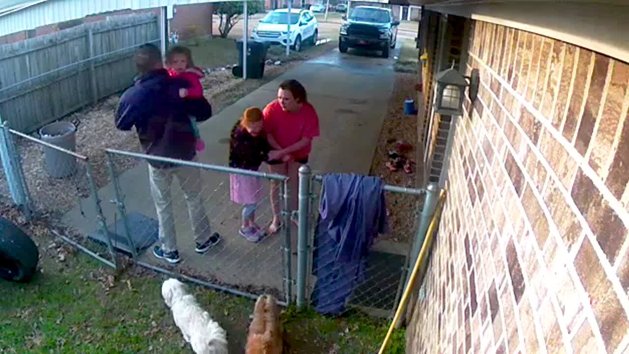 A teen boy sneaks up behind a man to scare him when he falls on the ice and hurts himself. Security footage.