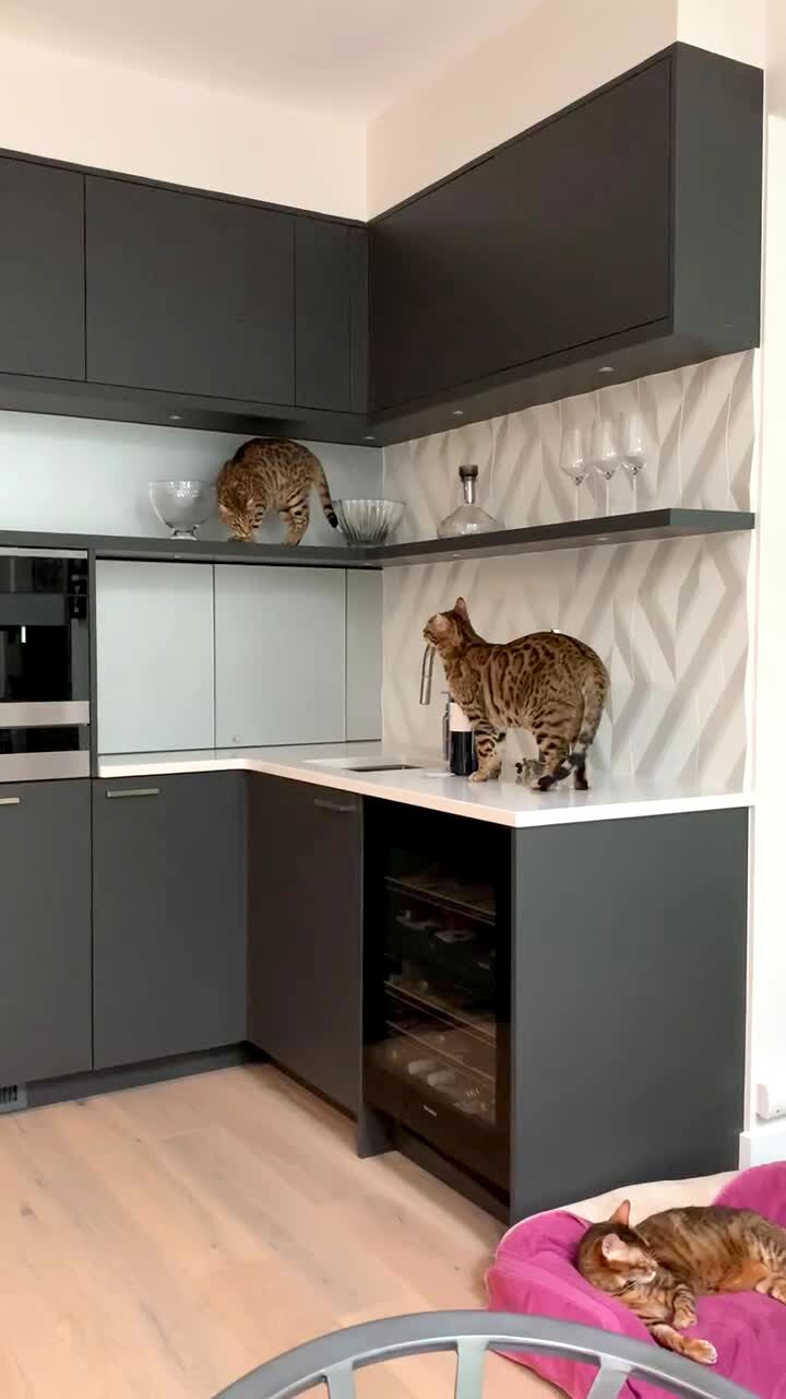 A cat on a counter has his head stuck in a Kleenex box. He walks backwards. The counter ends and the cat falls.