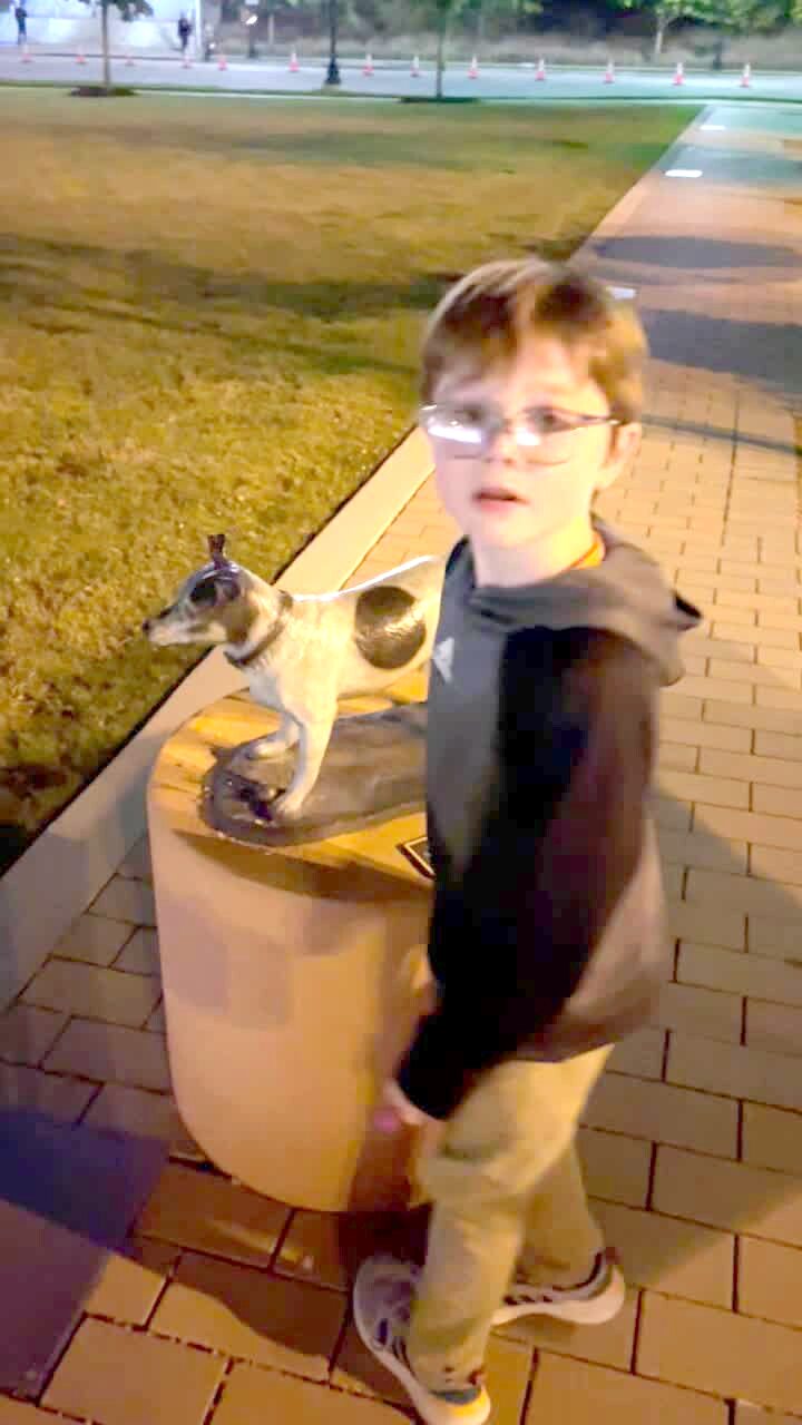 A dog tries to walk on an icy driveway. A young boy behind the dog falls. At 29 seconds, the dog moves his paws but does not go forward. He slides backwards.