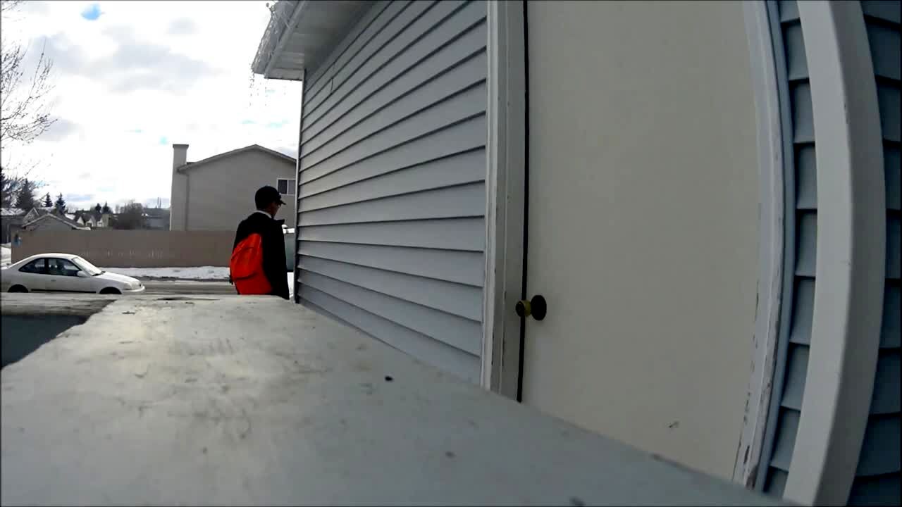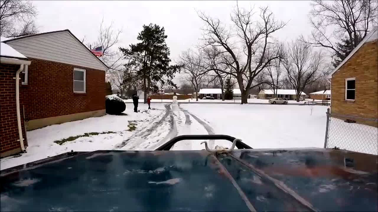 Teen boys make a war movie about destroying a snowman. Teen dressed as white ninja jumps off the deck and kicks large snowman's head off.