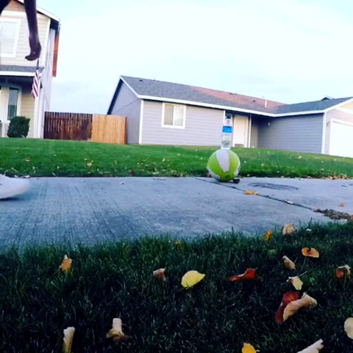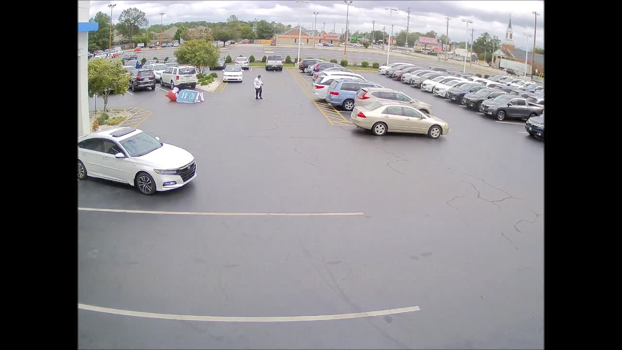 A produced video set to music of a large balloon mascot that blows out the door of a car dealership and across the parking lot. The video cuts to different camera angles as a man runs out of the dealership and chases the balloon around the lot. Security camera footage