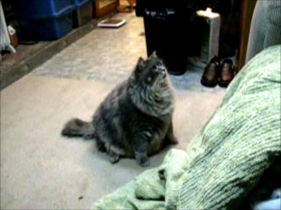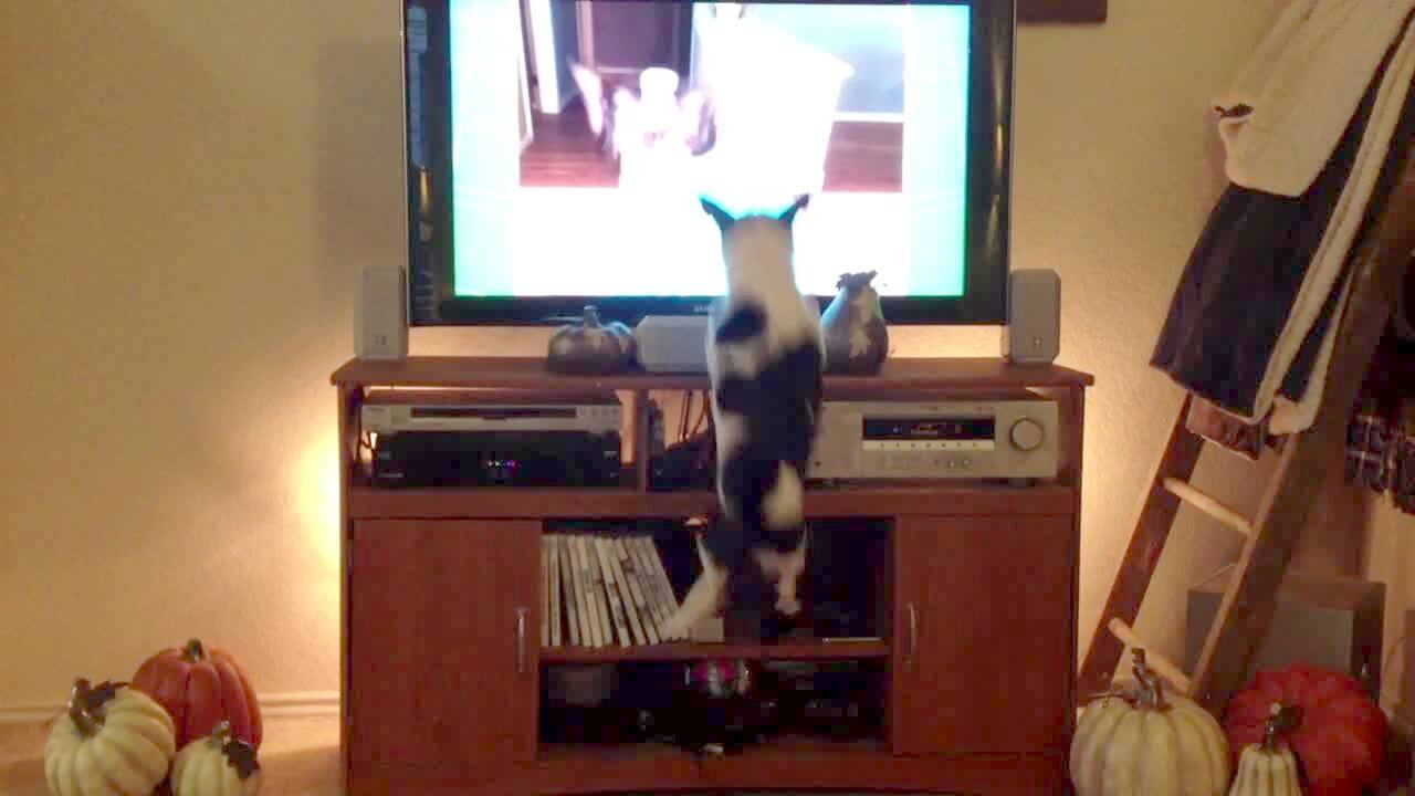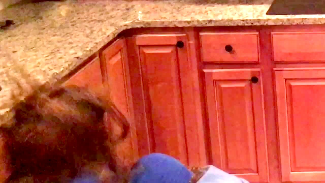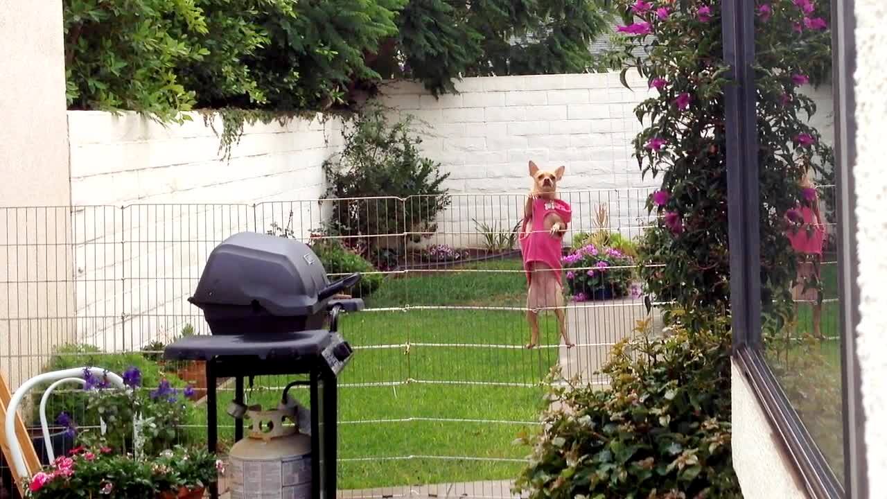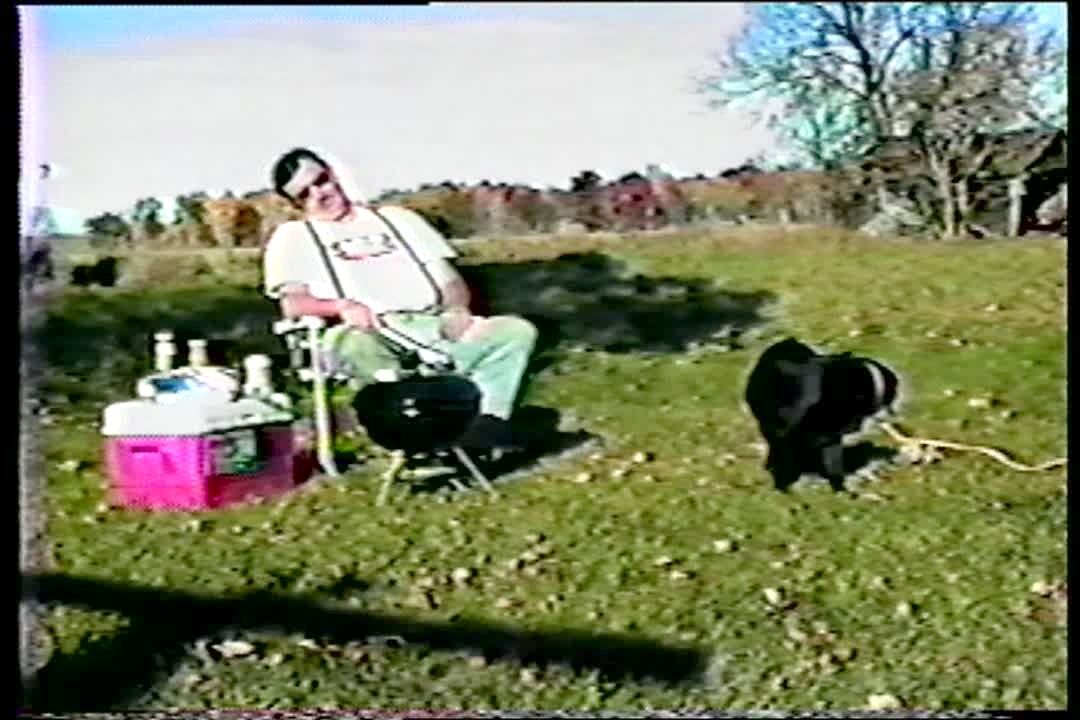 P/V Dog chews through leash and eats meat off Barbeque while man sleeps