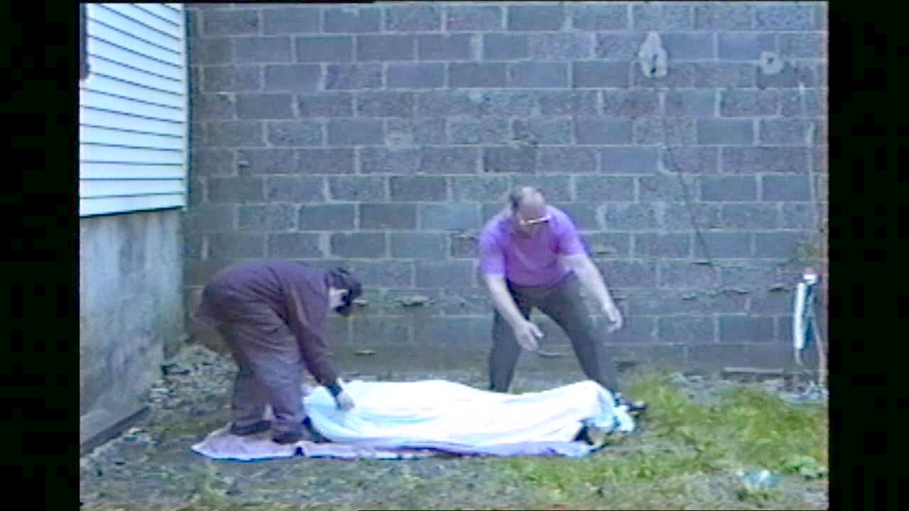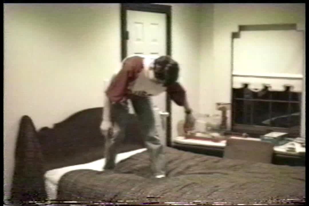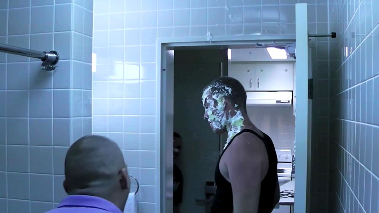Split screen horror spoof. Crab jumps on sleeping man's face and eats his head. (odd visual)