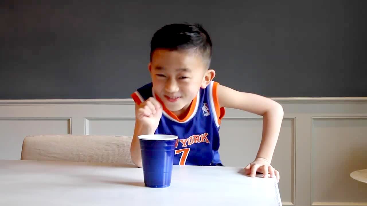 A young boy bounces a ping pong ball on a table and it bounces into a cup. Then he performs a series of ping pong tricks that increase in difficulty.