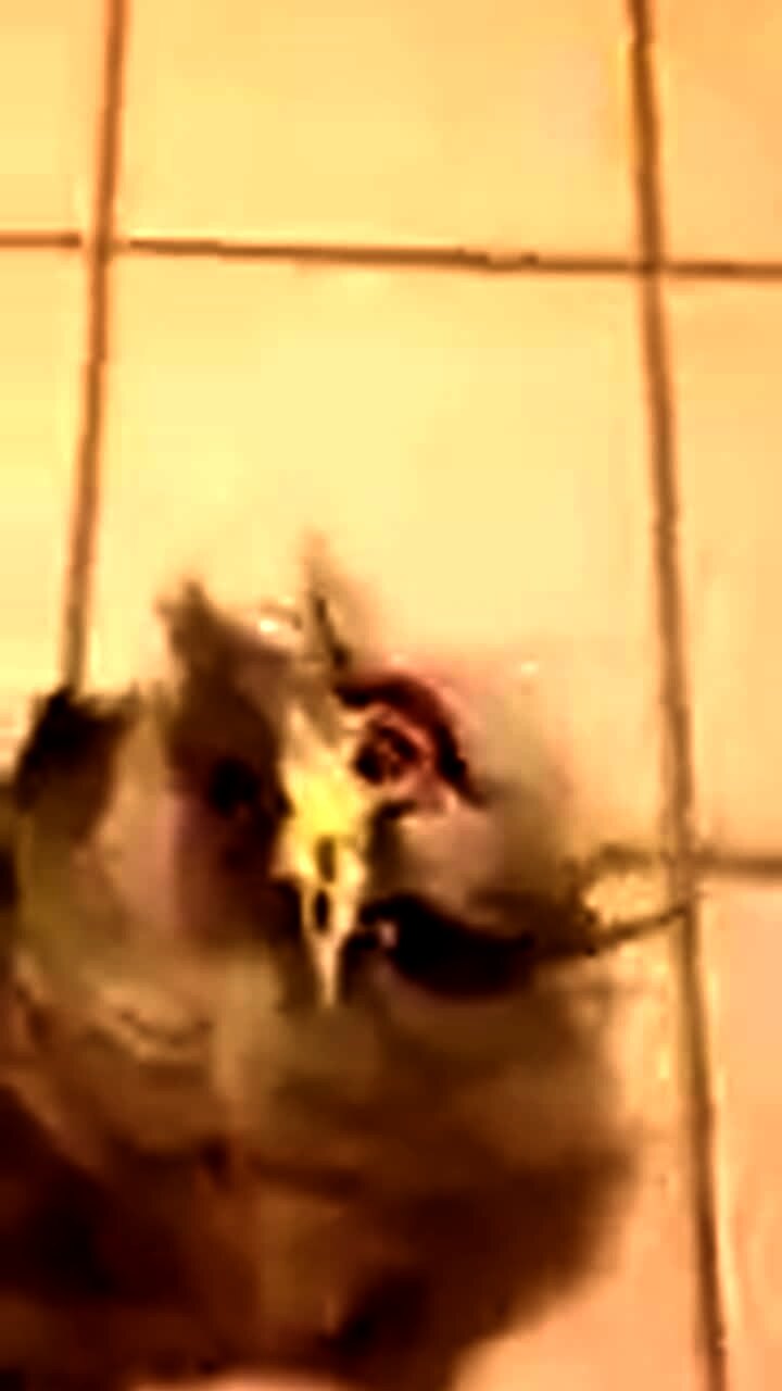 A kitten cat jumps and falls off of a window sill at home when a man power washes the glass from the other side.