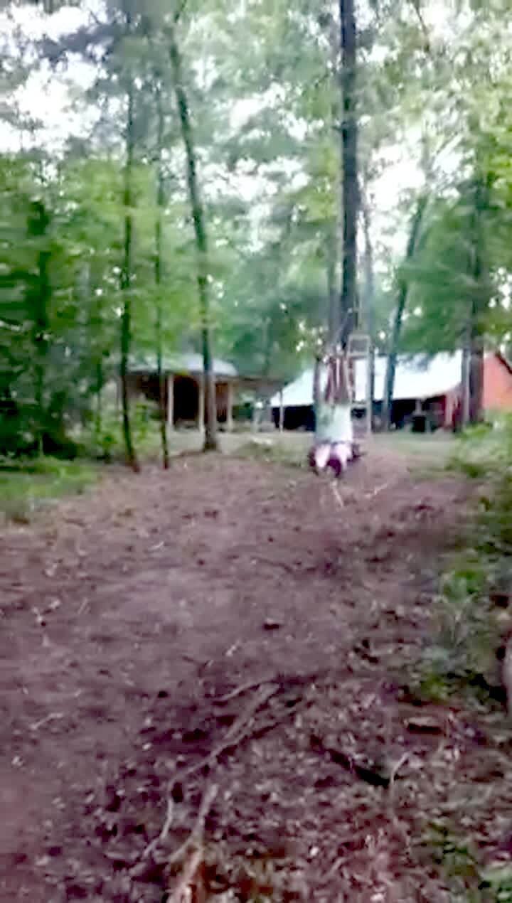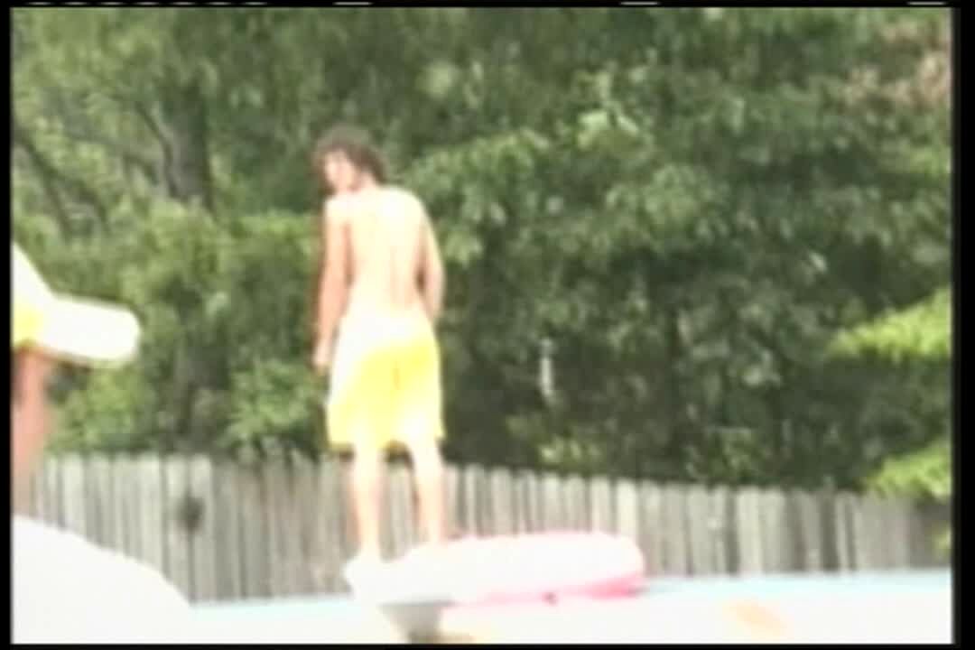 A teen boy runs up onto a porch then screams and screeches to a halt when he sees an opossum on the porch. He then runs away. Security footage.