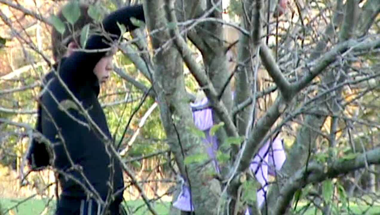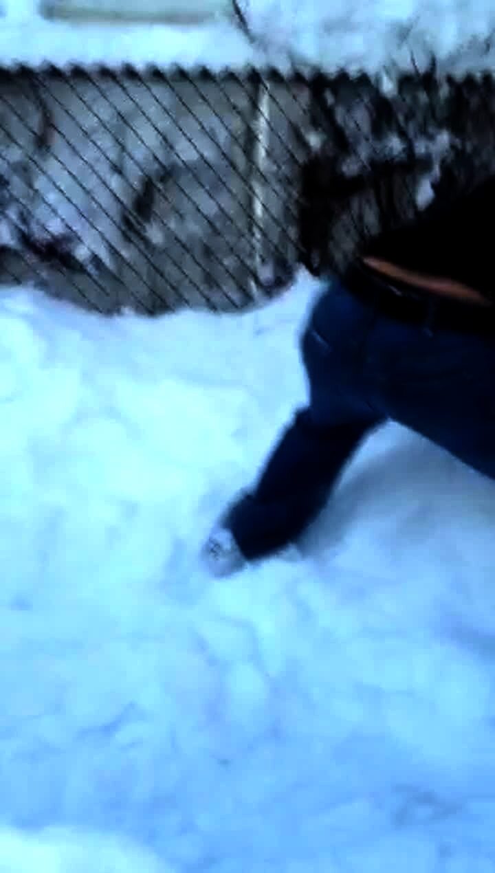 A teen girl opens a door and a fur hat falls on her and she screams outdoors.