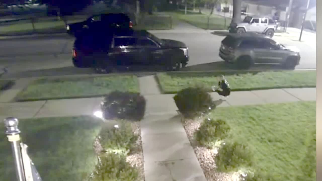 As a group of deer munch on flowers and plants in a front yard, a woman comes over her Ring camera speaker and yells, "Get out of my plants...I knew it was you..." The deer then scurry away. Security footage.