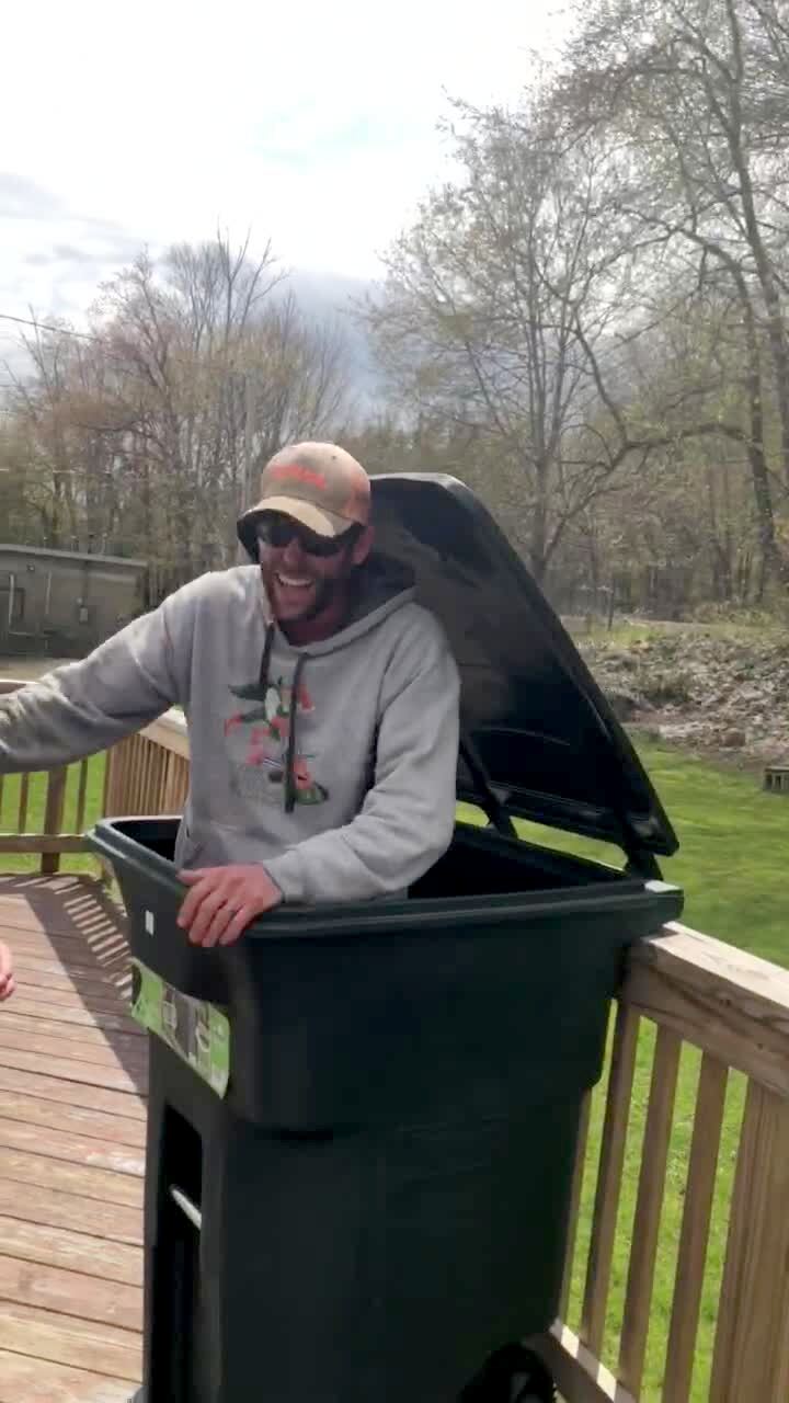 A man steps on squeaky toy on front porch and falls down. Security Footage