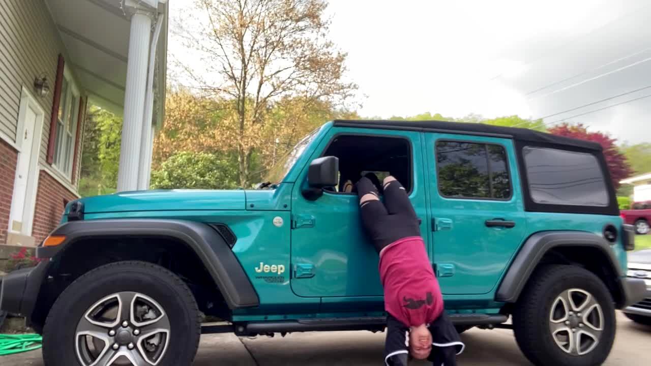 A man helps a woman do a handstand in the front yard. She sees a raccoon then swears, and runs into the house.