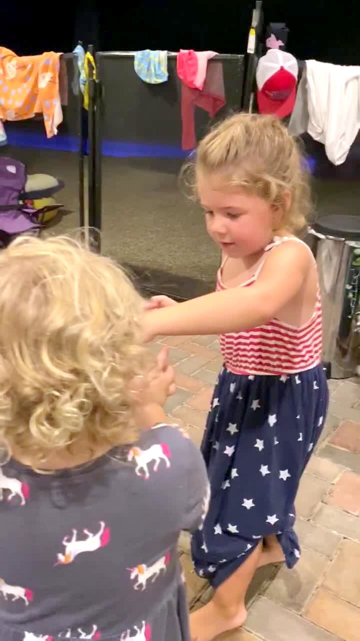 A tot girl runs through an obstacle course, and climbs up an obstacle. A woman tells her to say "I'm so strong", and she says "I'm so scared".