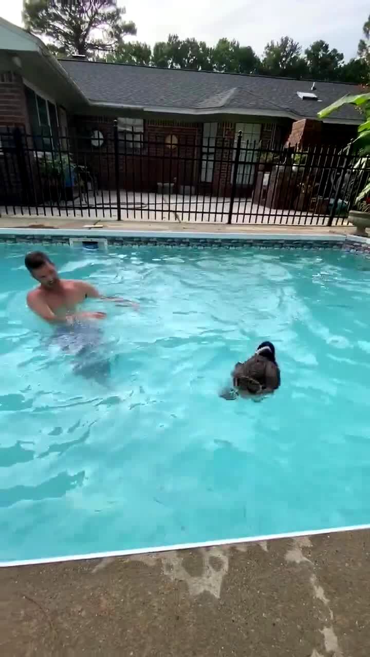 A woman tries to help a squirrel out of a gutter. It jumps out at her and she screams in a yard.