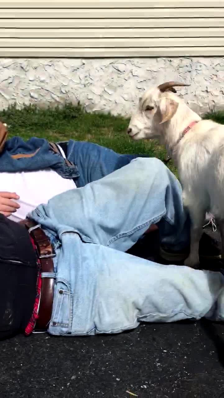 A man tries to catch a kitten cat on a front porch, then a bird flies towards him and he runs away and screams. A teen girl walks out and asks what happened. Security camera footage.