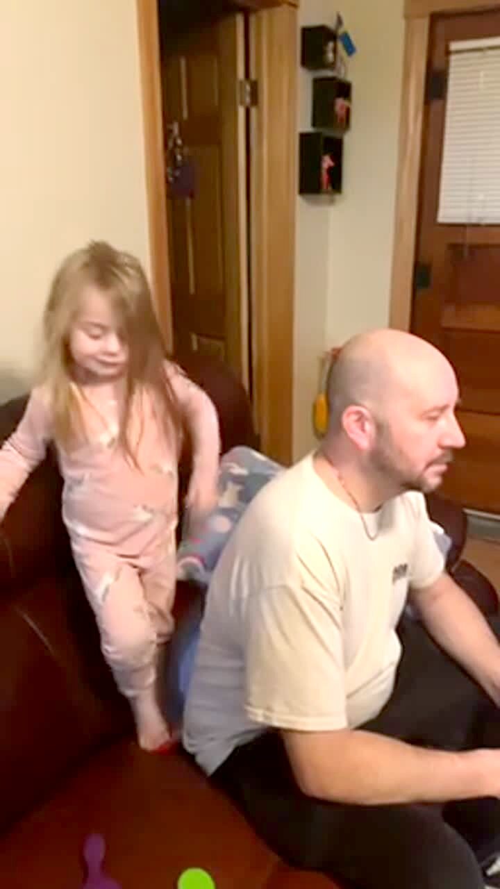 A tot girl walks up to a front porch and says, "Hey house, I'm here... hello." A man replies through a security camera, "Hello" and she screams and runs away. Home security camera.