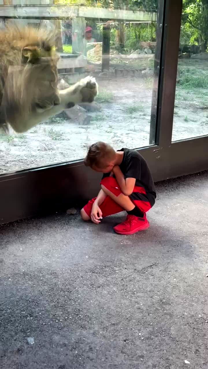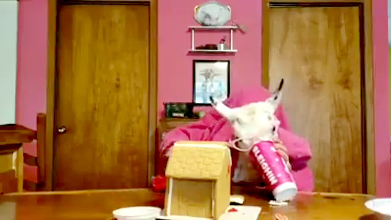 A person secretly records a video from outside a house of a teen boy while he eats whipped cream off his finger in the kitchen. In the next clip, the boy eats the whipped cream directly from the can. The person with the camera knocks on the window and the boy gets scared and looks at them.