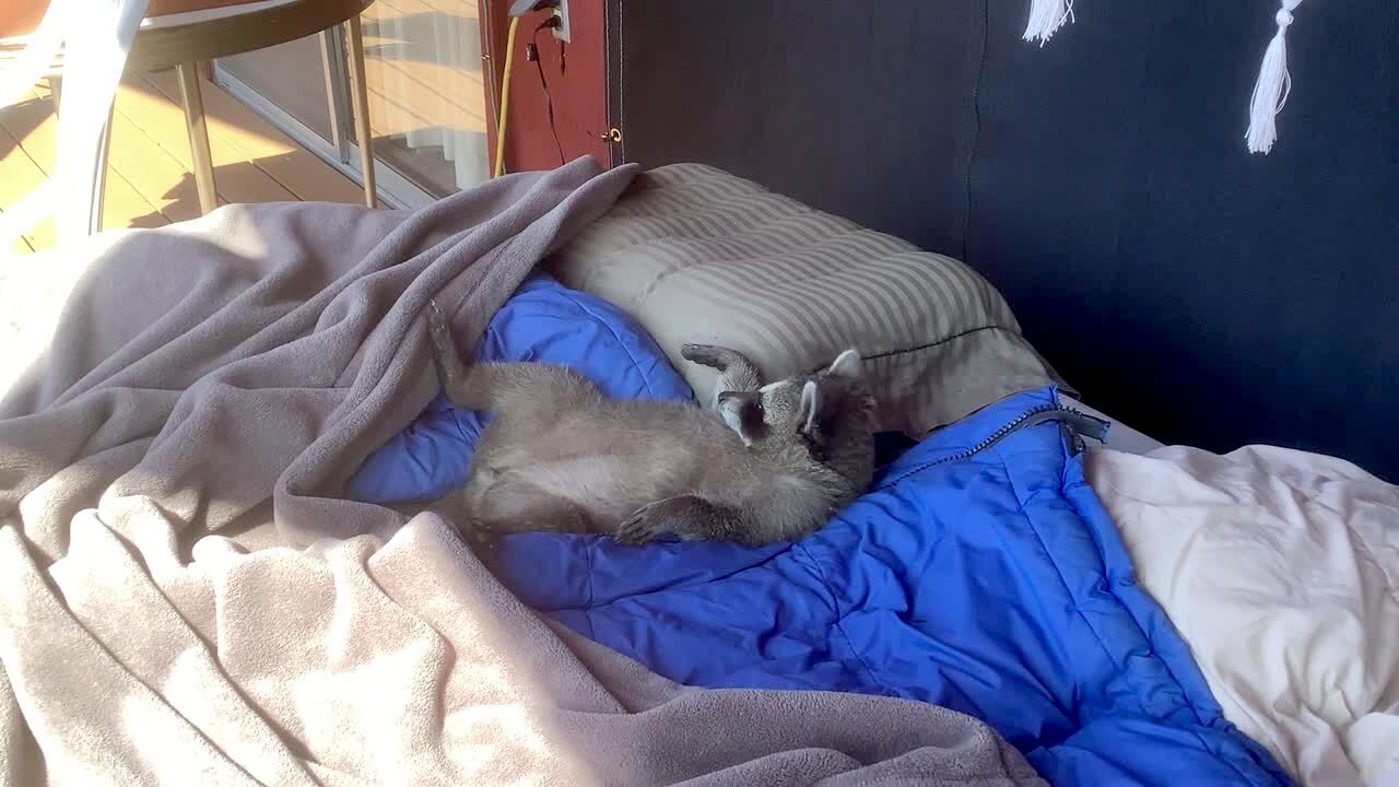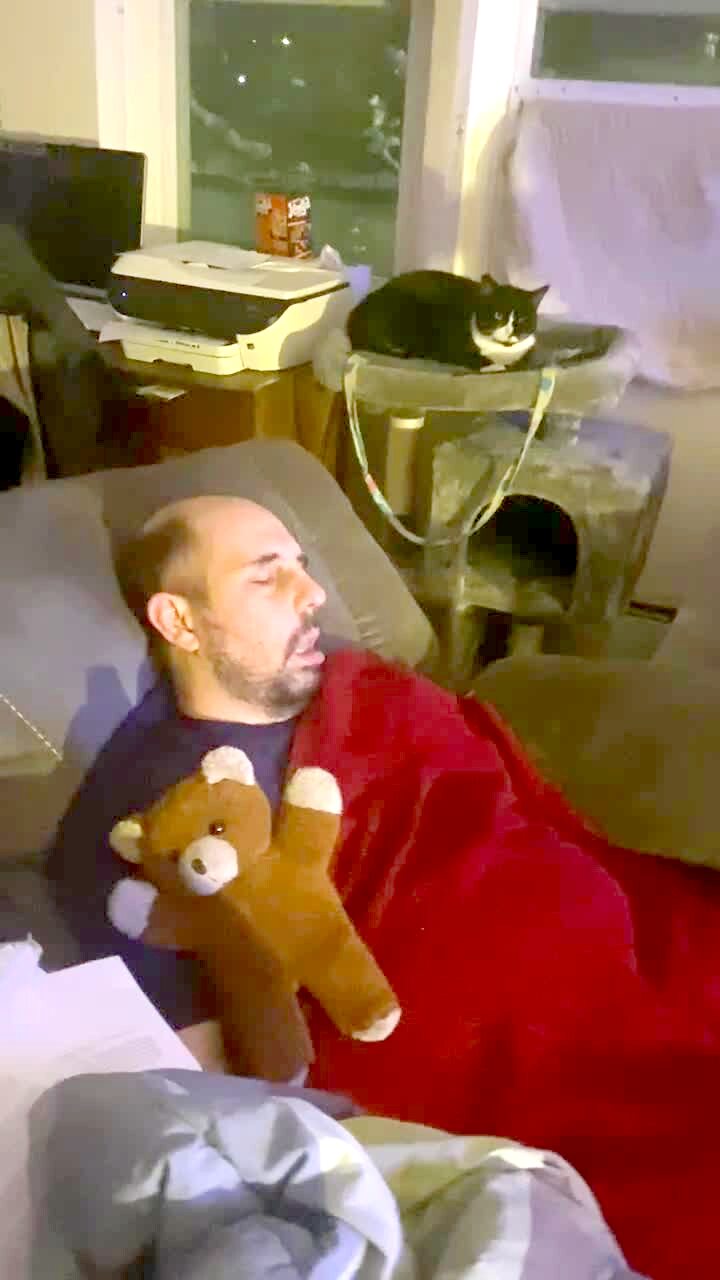 The camera moves back and forth between a man and a cat that both snore in bed.